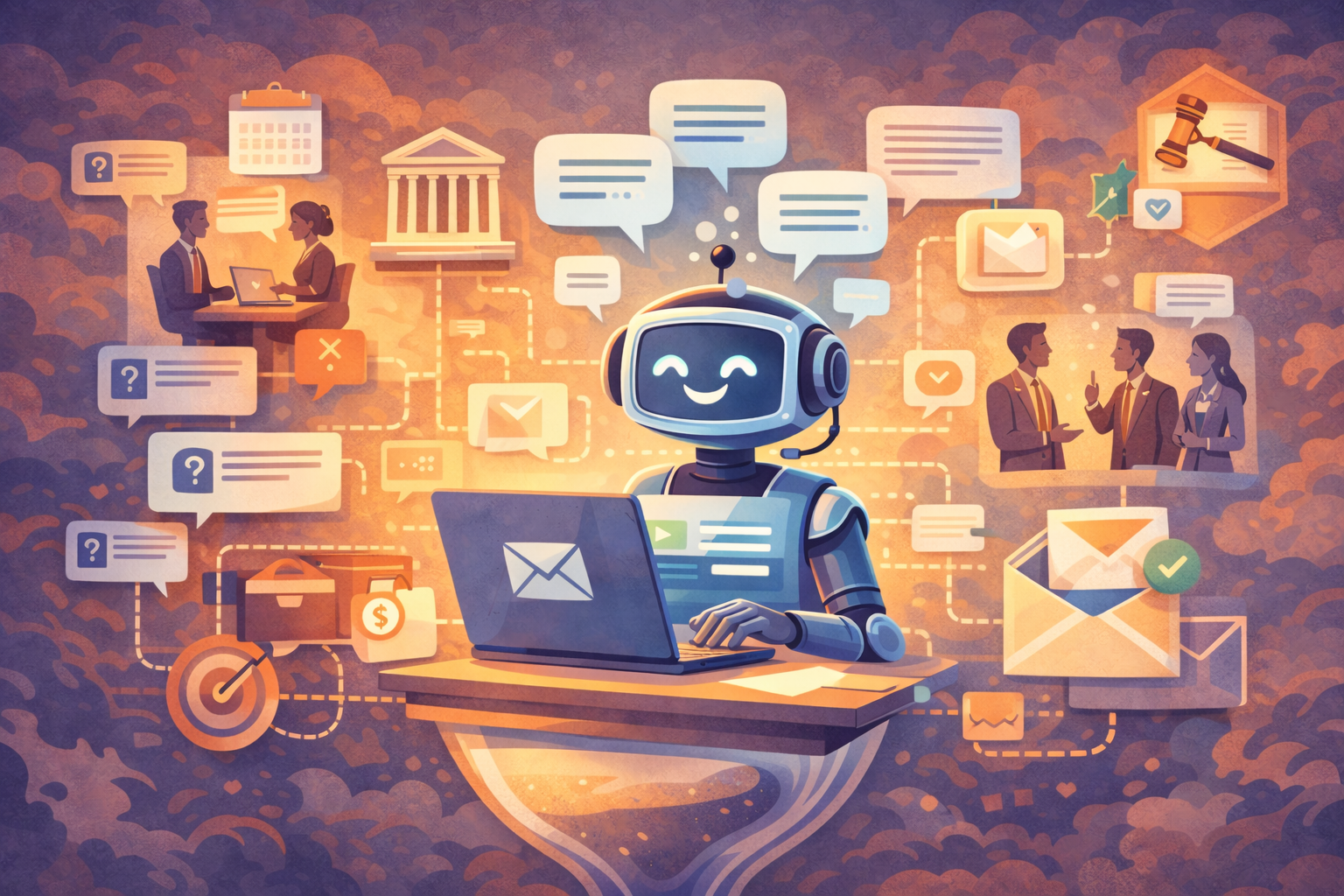A consultative AI agent answers client questions, provides guidance on legal services, submits requests, and accepts inquiries 24/7.