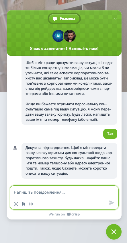 Conversational AI Agent for Serhii Lysenko & Partners Law Firm